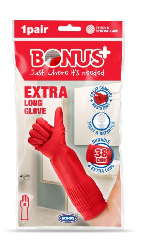 Ha eddig azért nem használtál gumikesztyűt, mert ki nem állhattuk, amikor a csuklónál beszivárgott a víz, kellemetlenné és feleslegessé téve a kesztyűviselést, akkor a BONUS+ Extra hosszú kesztyűt pont neked találták ki. 38 cm-es hossza tökéletes védelmet nyújt az egész alkar számára, így bátran belenyúlhatunk a vízbe, ráadásul ruha fölé is felhúzhatjuk, így óvja az öltözetünket is.