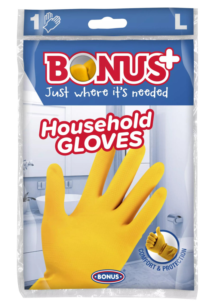 A BONUS háztartási latex gumikesztyű védelmet, extra higiéniát és kényelmet nyújt a háztartási feladatok elvégzéséhez.