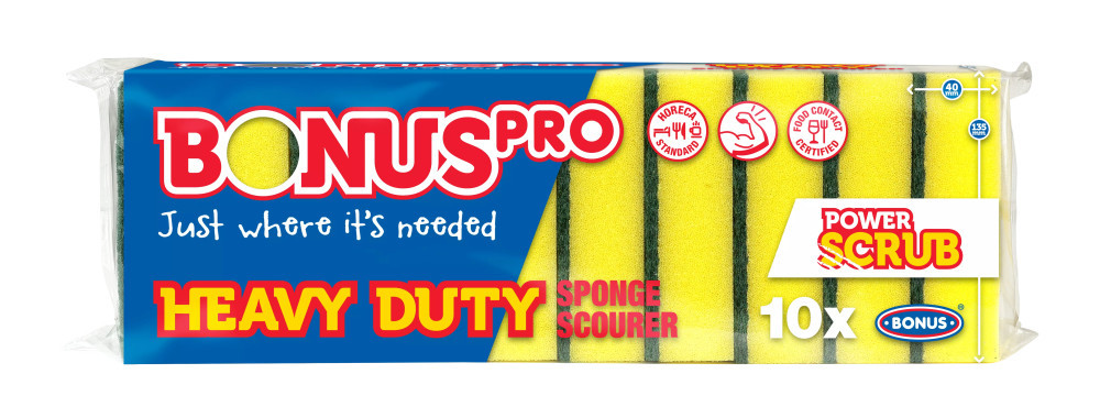 A BONUSPRO Heavy Duty szivacsunkat a professzionális felhasználók – éttermek, hotelek, étkeztetők, kórházak, közintézmények – számára minden igényt kielégítően alakítottuk ki. A tervezés során kifejezetten a HoReCa szegmens követelményeit vettük figyelembe. A gazdaságos 10 db-os kiszerelésben elérhető termékünket kvarckristályos zöld színű dörzsiréteggel láttuk el, mely hatékonyan távolítja el akár a száraz, akár a már feláztatott szennyeződéseket is.