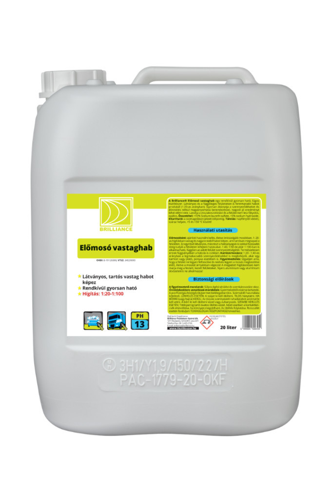 A Brilliance® Előmosó vastaghab egy rendkívül gyorsan ható, lúgos tisztítószer. Látványos és függőleges felületeken is fennmaradó habot produkál (1:20-as arányban). Gyorsan áztatja a szennyeződéseket és dörzsölés nélkül magasnyomású berendezéssel, nagyon jó eredményt lehet elérni vele. Lassítja a visszakoszolódást és a felület nem lesz fátyolos, opálos.