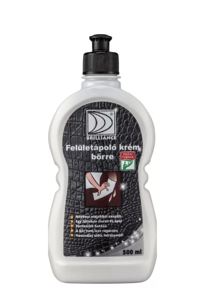 A megújult Brilliance® Felületápoló krém bőrre felújítja a bőr felületeket, a felület selyemfényű lesz, de nem ragacsos. Tisztítja és ápolja a felületet egyszerre, használat után az ujjlenyomatok sem látszanak meg. 100%-ban környezetbarát termék, mivel kőolajszármazék mentes összetételű. Újdonsága a kiváló minőségű olajokban rejlik.