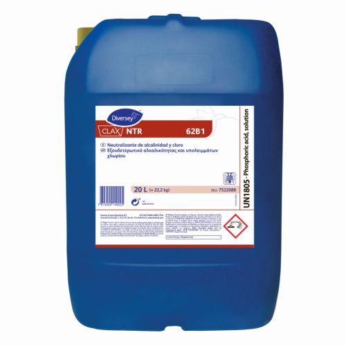 A Clax NTR egy mosodai semlegesítőszer, amelyet kifejezetten kereskedelmi és telephelyi mosodákban való használatra fejlesztettek ki. Ezt a terméket az utolsó öblítésben kell felvinni, hogy semlegesítse a lúgmaradványokat és csökkentse az aktív klór nyomait.