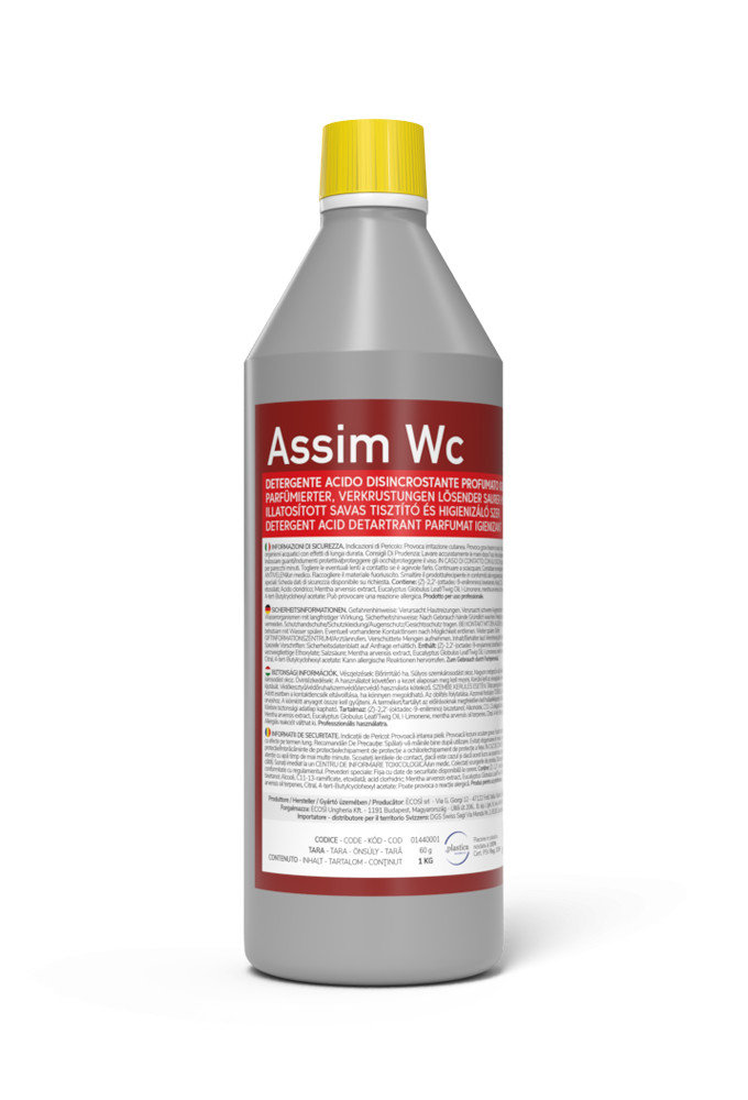 Az ASSIM WC egy savas tisztítószer, amely nagy vízkőoldó hatással rendelkezik WC-k és piszoárok higiéniájára és tisztítására. Magas viszkozitású formulájának köszönhetően nagyon jól tapad a függőleges felületekhez, megkönnyítve a tisztítást. Ne használja csaptelepeken és krómozott felületeken.
