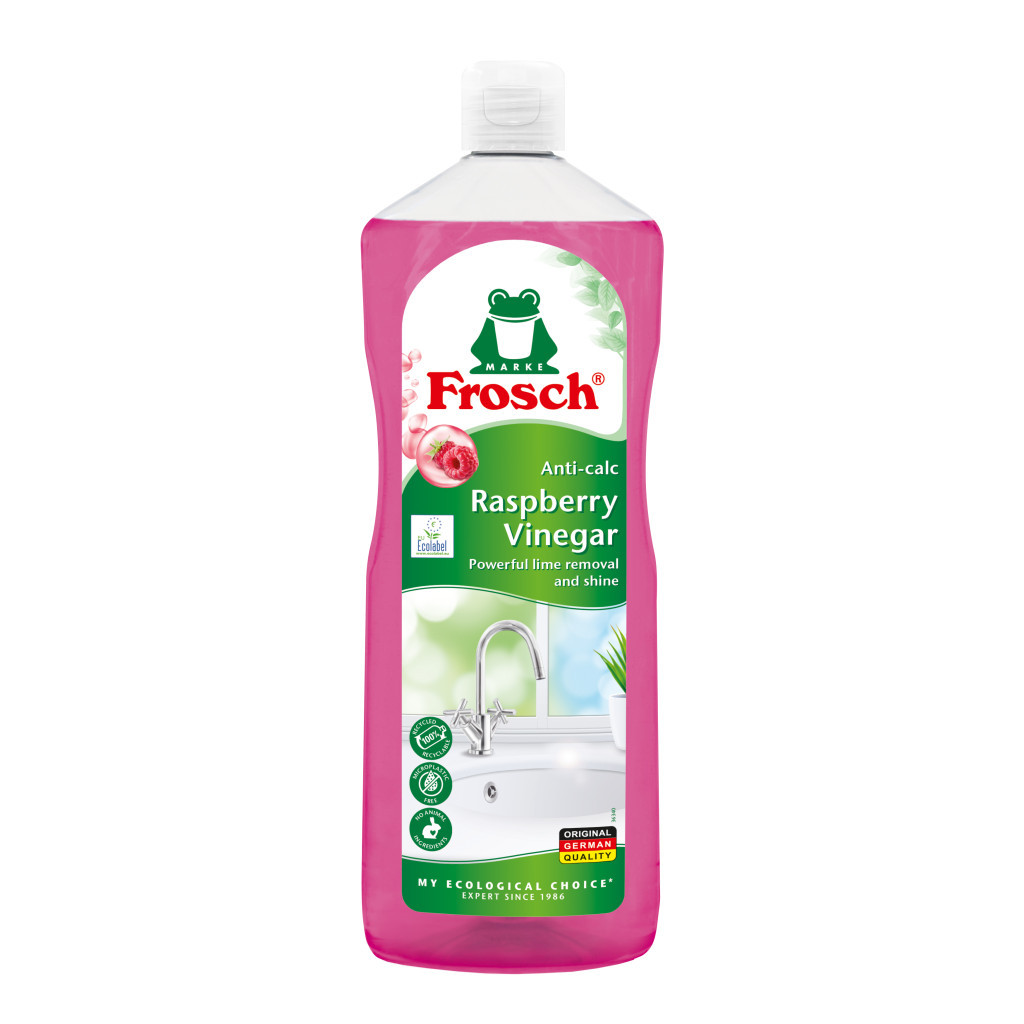 Frosch Általános tisztítószer málnaecet tartalmával tartós, csíkmentes tisztaságot biztosít, eltávolítja a vízkövet, a lerakódott szennyeződéseket pl szappanlerakódásokat, és a vízfoltokat. Használható fürdőszobai és konyhai felületeken, valamint járólapokon is. Málnaecetet tartalmaz, friss málna illattal járul hozzá a tisztasághoz.
