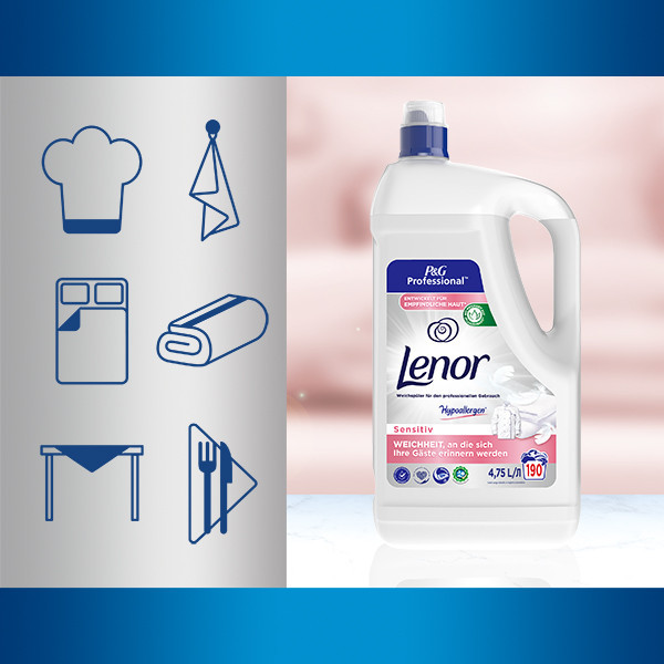 A Lenor Professional Sensitive öblítőszer hosszantartó lágyságot, puhaságot és friss illatot biztosít. A készítményt bőrgyógyászatilag tesztelték és jóváhagyta a Bőregészségügyi Szövetség (Skin Health Alliance). Érzékeny bőrre ajánlott használni. Öblítő használata esetén a ruhanemű jobban vasalható és bolyhosabb (pl.törölköző), ezzel egyidejűleg csökken a szövetek statikus töltése. A textilöblítő lágyító technológiát tartalmaz, amely megvédi a szálakat a sérülésektől, ezáltal hozzájárul a textil élettartamának meghosszabbításához és pénzt takarít meg pl. új ágynemű vásárlásakor. Parfüm mikrokapszulákat hagy a textílián, amelyek a súrlódás hatására fokozatosan felszabadulnak és tartós illatot kölcsönöznek neki. A diffúziós technológiának köszönhetően az illat fokozatosan szabadul fel a textíliában és hosszú ideig frissen hagyja a szárítóban történő szárítás után is.