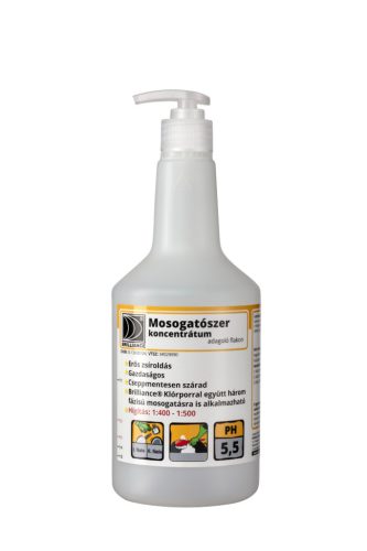 A Brilliance® Mosogatószer koncentrátum nagyhatású üzemi mosogatószer, zsíroldékonysága kiemelkedő (24 tányérszám), a már kihűlt vízben is hatékony. Gyorsan, cseppmentesen szárad. Alkalmazható háromfázisú mosogatáshoz az első fázisban, zsíroldásra.