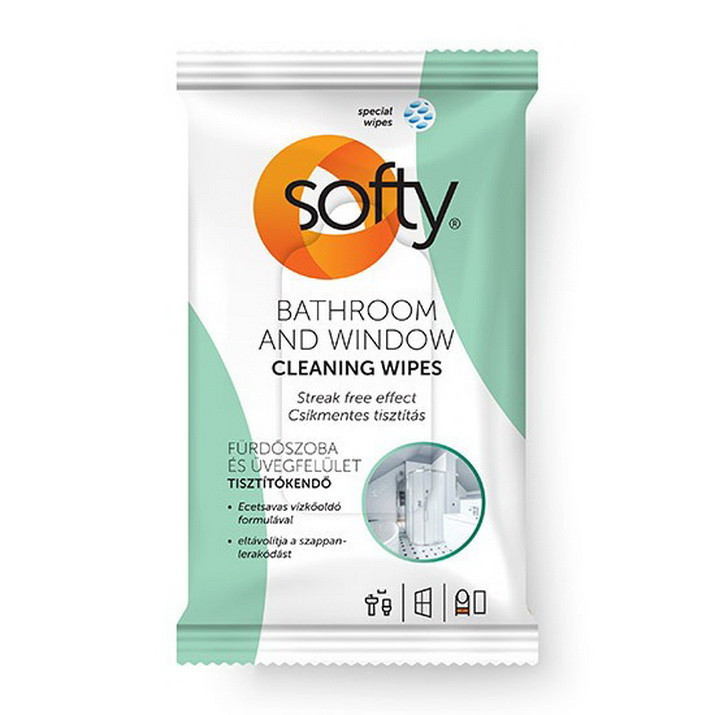 A Softy fürdőszoba és üveg felület tisztítókendő hatékonyan távolítja a vízkövet és a szappanlerakódásokat a fürdőszobában. Emellett ablak- és tükörtisztításra is kiválóan alkalmas, mivel ragyogó és csíkmentes felületet hagy maga után.