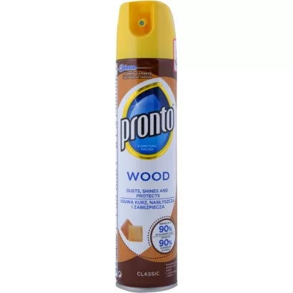 A Pronto® Classic bútorápoló aeroszol fényesíti az otthonában található legtöbb kemény felületet, kiemeli szépségüket, eltávolítja róluk a port és az ujjlenyomatokat, valamint csillogóvá varázsolja őket anélkül, hogy bármilyen zsíros, olajos nyomot hagyna maga után.