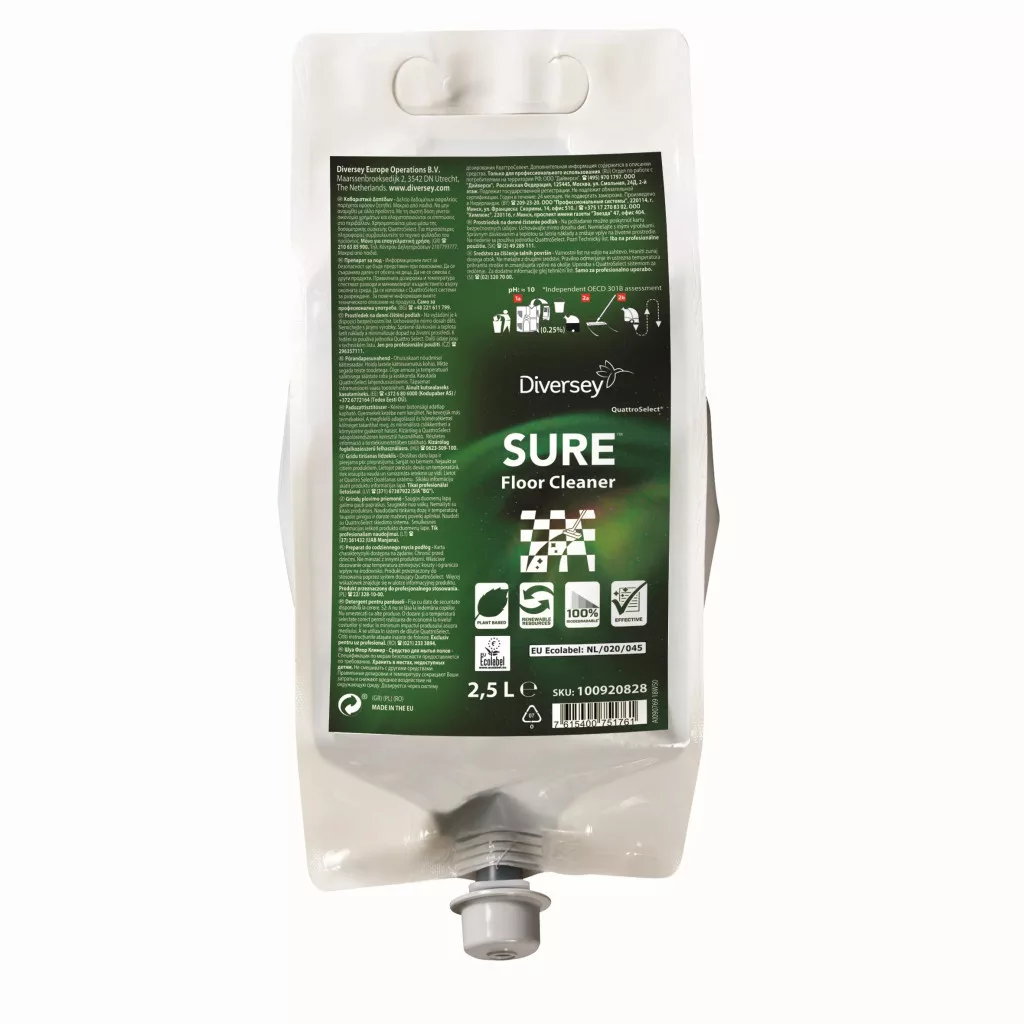 A SURE Floor Cleaner QS az egyedi SURE termékkör tagja, mely 100%-osan lebomló*, növényi alapú összetétellel rendelkező professzionális tisztítószereket kínál minden napi tisztítási feladat elvégzésére. A SURE Floor Cleaner egy fékezett habzású, koncentrált padozattisztító szer koncentrátum, mely minden vízálló padlófelület tisztítására alkalmas.