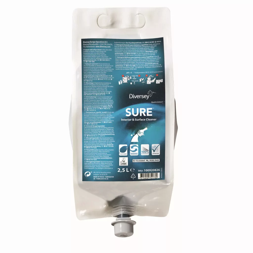A SURE Interior & Surface Cleaner a növényi alapú, 100%-ban biológiailag lebomló professzionális tisztítószerek egyedülálló termékcsaládjának része, minden napi tisztítási igényhez. A SURE Interior & Surface Cleaner egy koncentrált univerzális tisztítószer tasakos kiszerelésben kemény felületek tisztítására (élelmezési helyiségekben is), és alkalmas padlókra, falakra, ajtókra, mennyezetekre és általános berendezésekre.