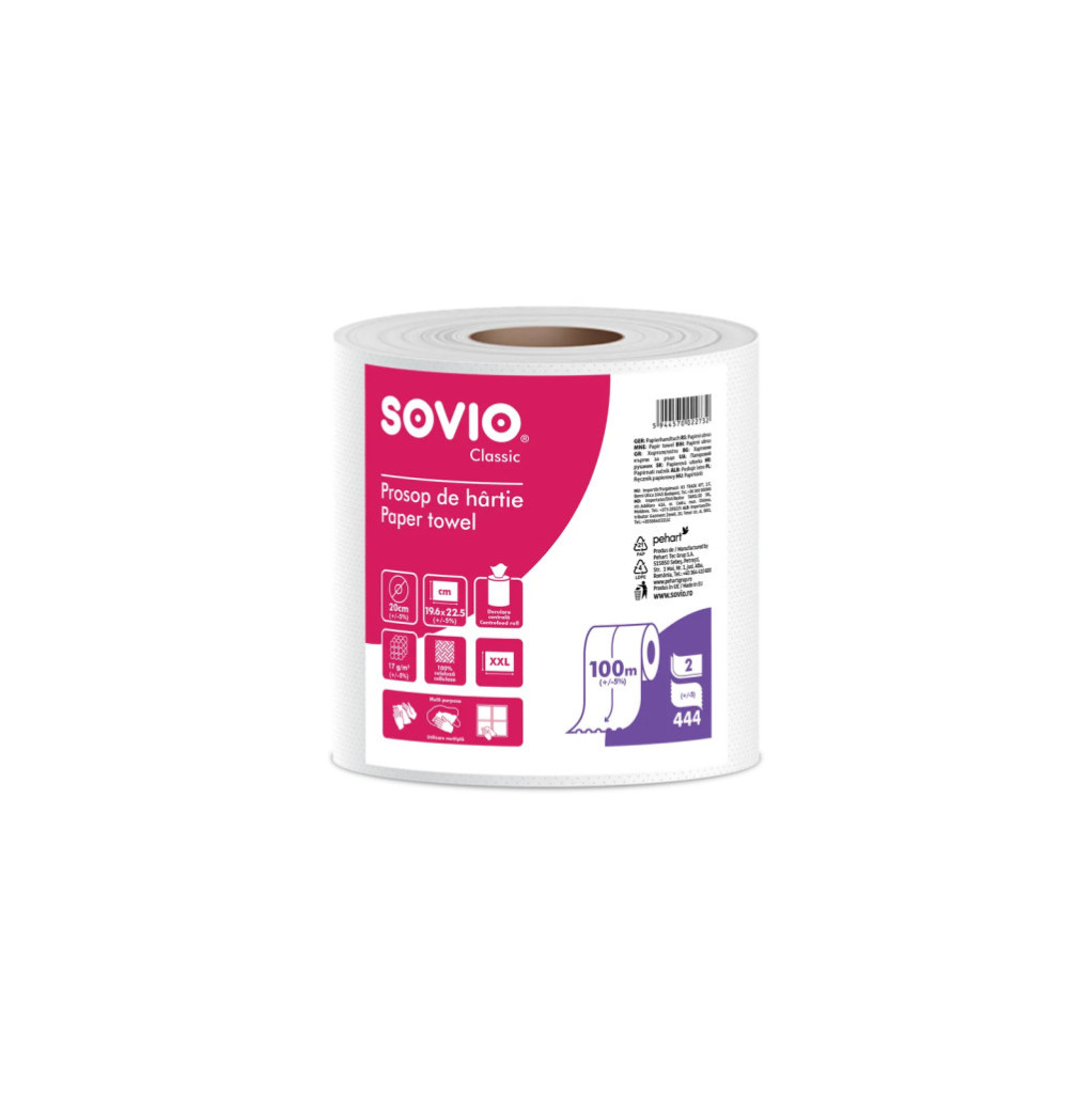 Sovio tekercses törlő 444 lap, 2 rétegű, 20cm átmérő, 100m/tekercs, 6tek/karton (40karton/raklap)