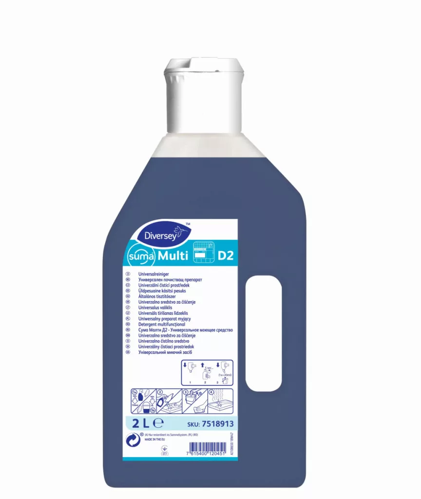 A Suma Multi D2 egy általános felülettisztítószer koncentrátum, mely minden konyhai vízálló felület, pl. falak, ajtók, mennyezet, és berendezési tárgyak tisztítására alkalmas.