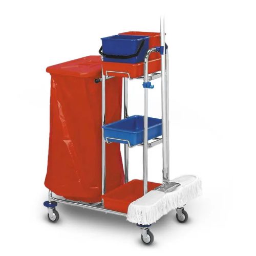 A kocsi 3 műanyag tálcával van felszerelve, amelyek elegendő helyet biztosítanak a tisztítószerek és egyéb eszközök tárolására. Az egyik tálcában 2 db 6 literes vödör kapott helyet, amely megkönnyíti a hatékony takarítást. A 120 literes hulladékzsák tartó lehetővé teszi a szemétgyűjtést egy helyen.