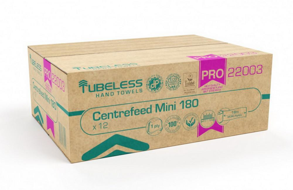 Tubeless PRO 180 Mini tekercses kéztörlő 1 rétegű, fehér, 100% cellulóz, 726lap, 181,5m 12db/zsugor