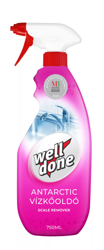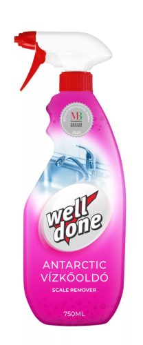 Well Done Antarctic vízkőoldó, fürdőkádak, csapok, csempék és a toalett tisztítására. Oldja a vízkövet, kiválóan tisztít csempét, fémet, kerámiát és csillogó tisztaságot eredményez az egész fürdőszobában.