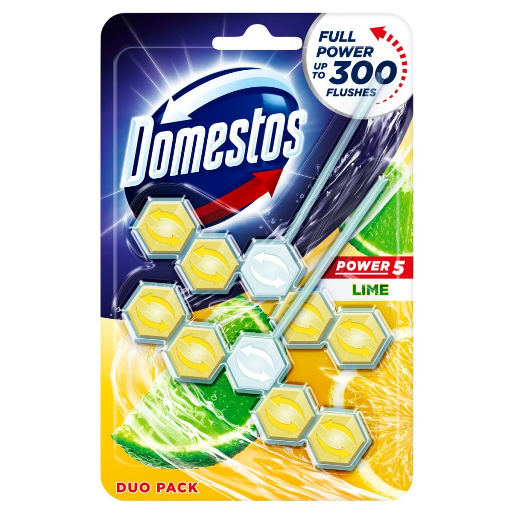 A Domestos Power5 WC frissítő blokk – Lime illattal (2×55 g) hatékony WC-frissítő, amely folyamatosan tisztítja és illatosítja a WC-t minden öblítéskor. A lime illat üde, citrusos aromát biztosít, miközben segít megelőzni a kellemetlen szagok kialakulását.