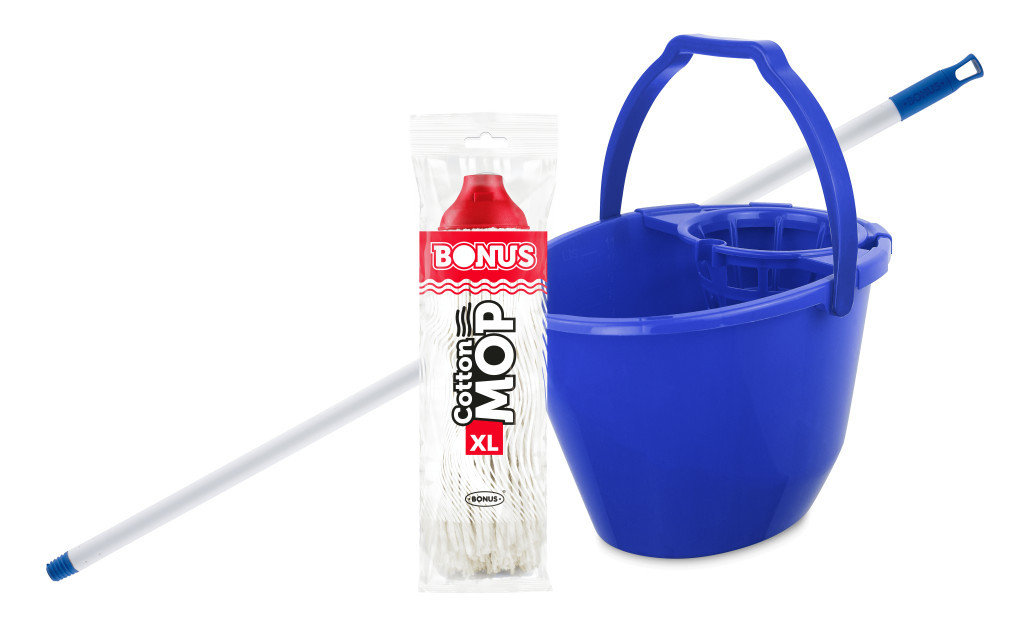 Bonus Felmosó szett-vödör KÉK 11L csavaró kosár, felmosó nyél 120cm CottonMop 190gr