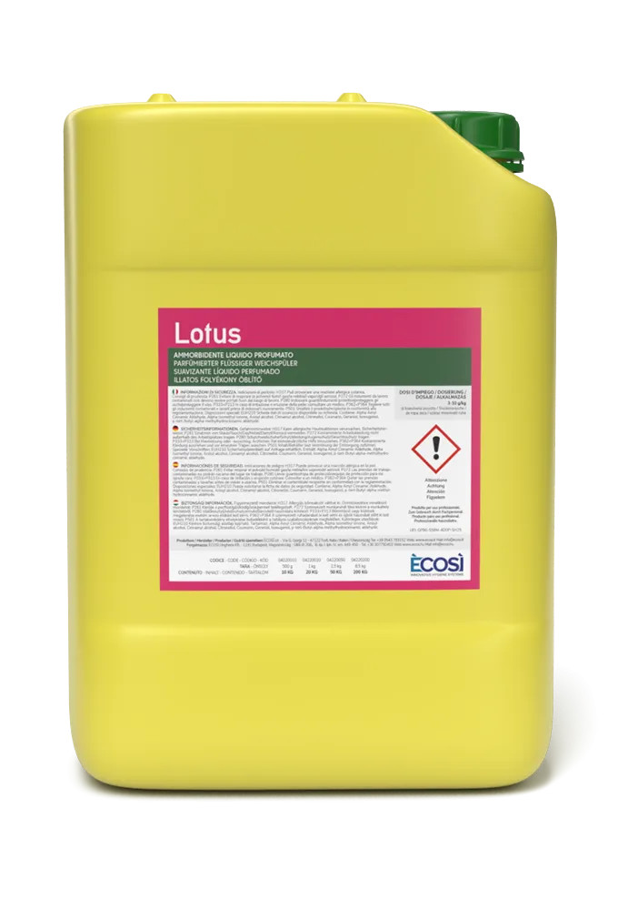 ÈCOSÌ Lotus – Ipari textilöblítő szuperkoncentrátum (10L / 20L) Az ÈCOSÌ Lotus egy szuperkoncentrált ipari textilöblítő, amely hosszan tartó, friss illatot és kellemes tapintást biztosít a textíliáknak. Hatékonyan lágyítja a ruhákat, miközben megkönnyíti a vasalást is. Kiválóan alkalmazható mosodákban, szállodákban és nagyforgalmú mosási környezetekben. Elérhető 10 literes és 20 literes kiszerelésben, a nagyobb igénybevételhez igazítva.